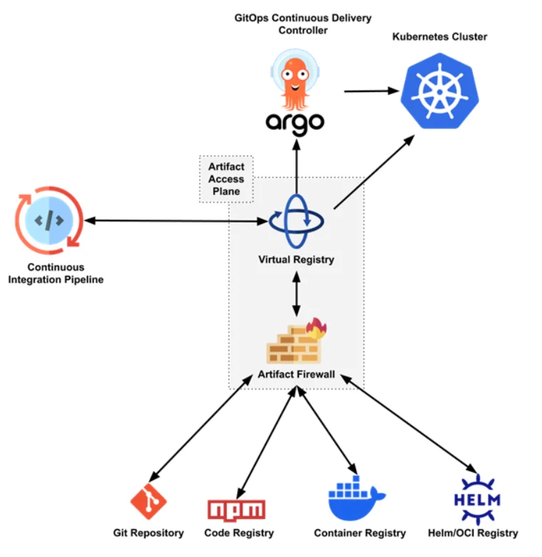 This plane does not replace registries or Kubernetes-native controls. Instead, it complements them by governing how artifacts are accessed across CI/CD systems, GitOps controllers, security scanners, and deployment pipelines.