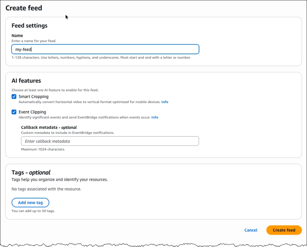 After creating your feed, you can configure outputs for either vertical video cropping or clip generation. For cropping, you can start with an empty feed. The service automatically manages cropping parameters based on your video specifications. For clip generation, choose Add output, provide a name (such as “highlight-clips”), select Clipping as the output type, and set the status to ENABLED.