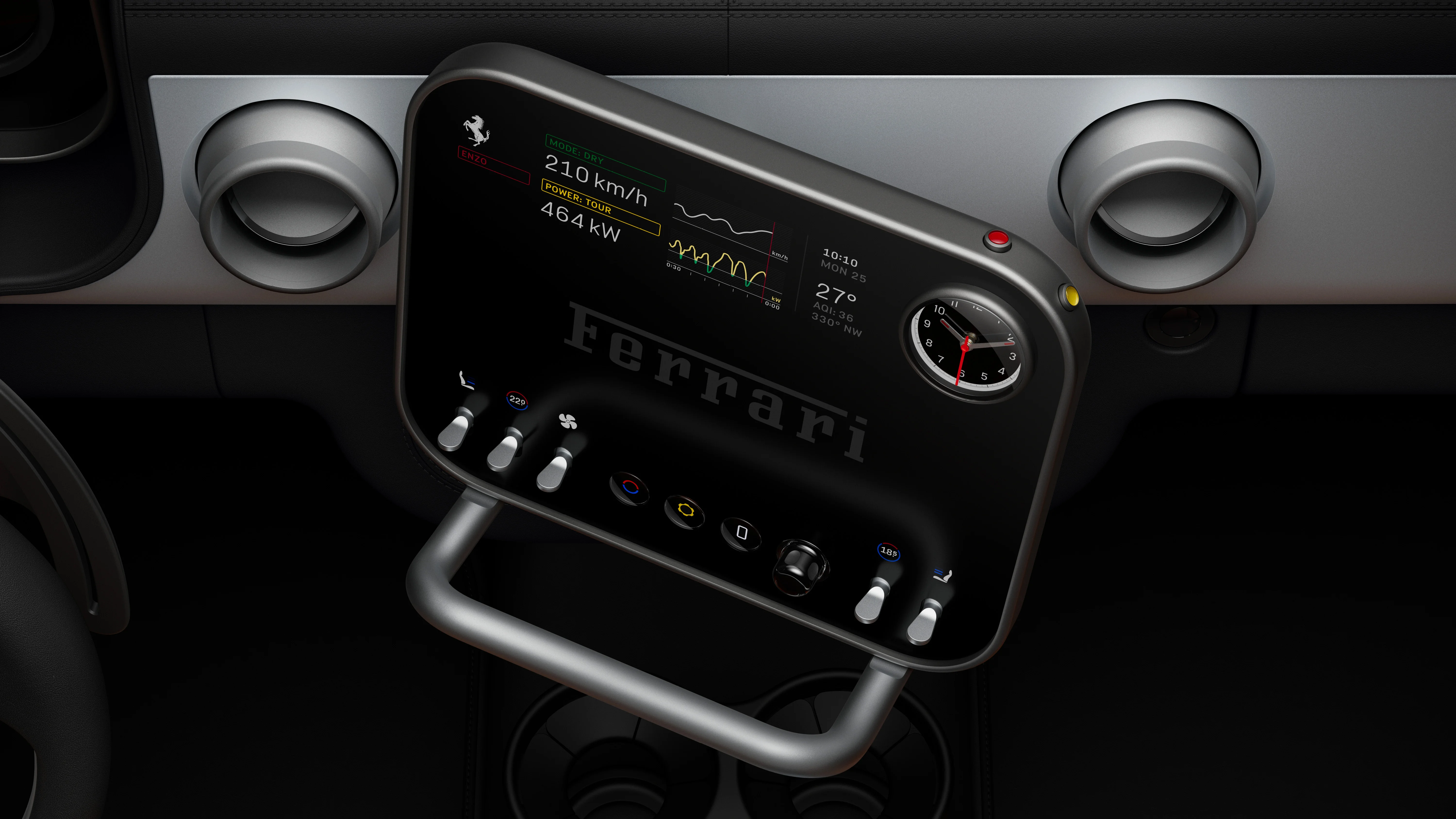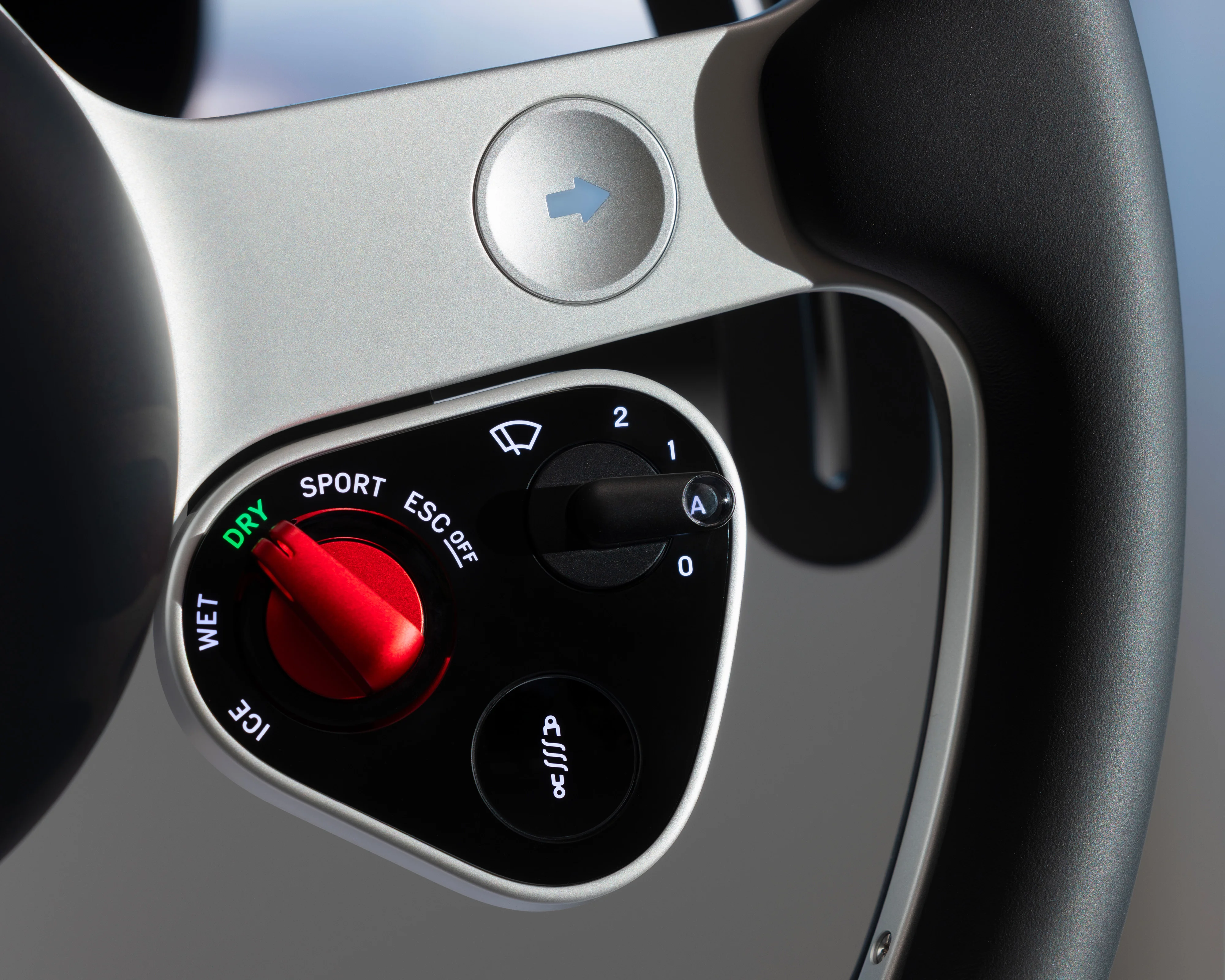 The central display sits on a ball-and-socket joint, allowing it to rotate toward either the driver or passenger. It also includes a palm rest so you can interact with controls without looking. And the mechanical multigraph display with three independent motors functions as a clock, chronograph, compass, or launch control indicator.
