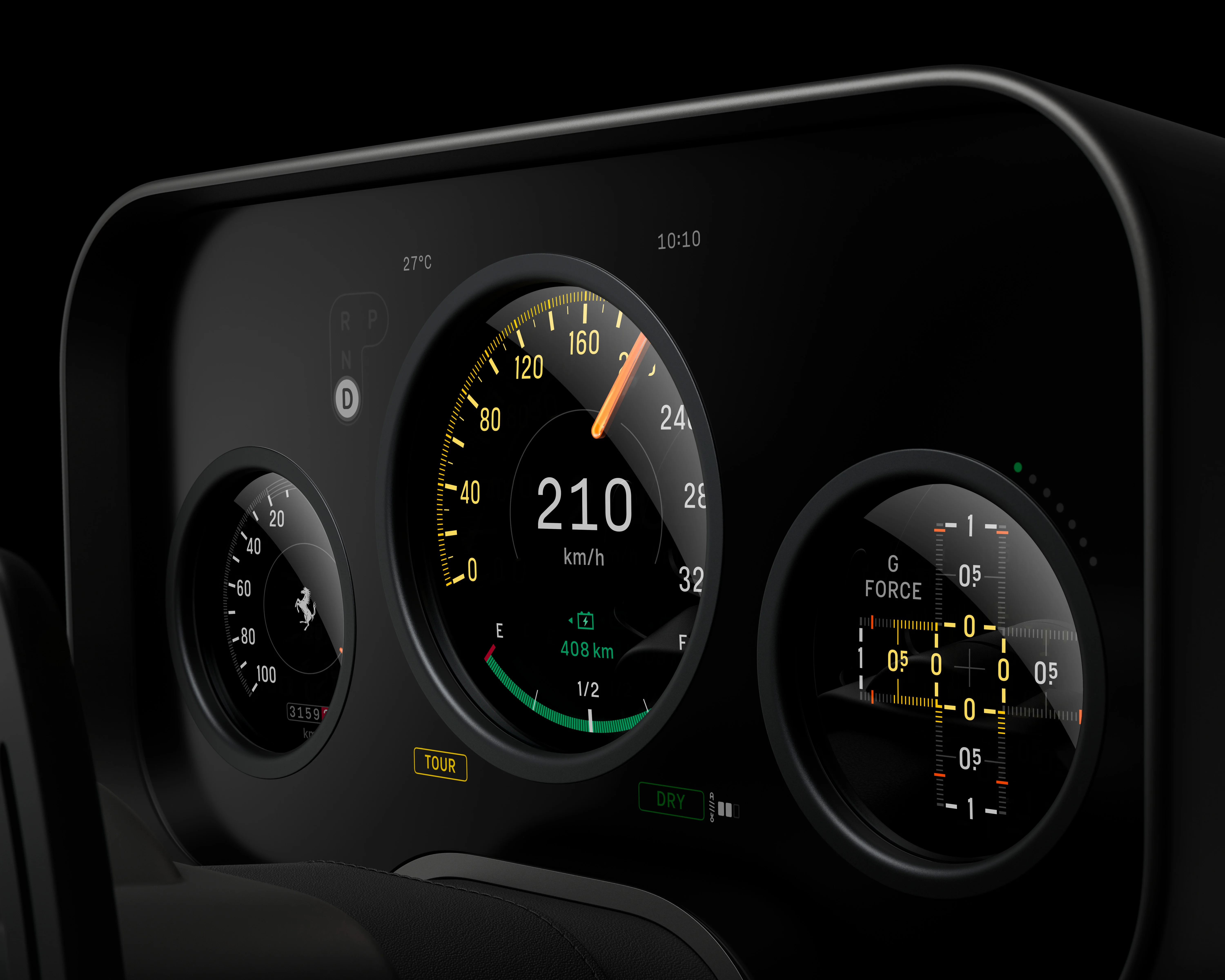 The Luce has three main displays: an instrument cluster, a central display, and rear control panel. The gauge cluster actually moves with the steering wheel (a Ferrari first), using overlapping OLED displays that blend digital and analog cues. The ultra-thin OLED displays are made by Samsung with cutouts that reveal a second display underneath, adding literal visual depth.