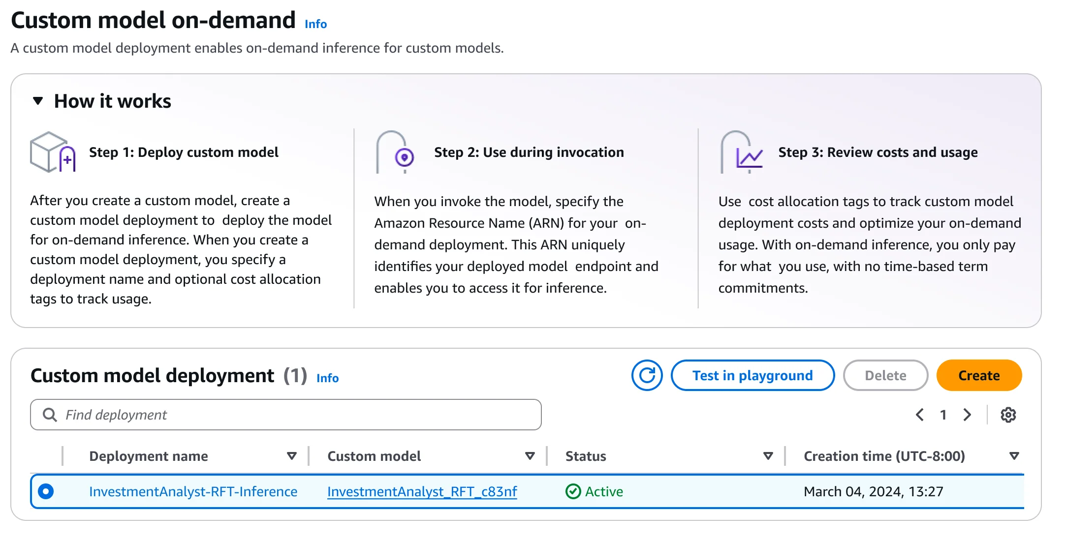 After deployment, I can quickly evaluate the model’s performance using the Amazon Bedrock playground. This helps me to test the fine-tuned model with sample prompts and compare its responses against the base model to validate the improvements. I select Test in playground.