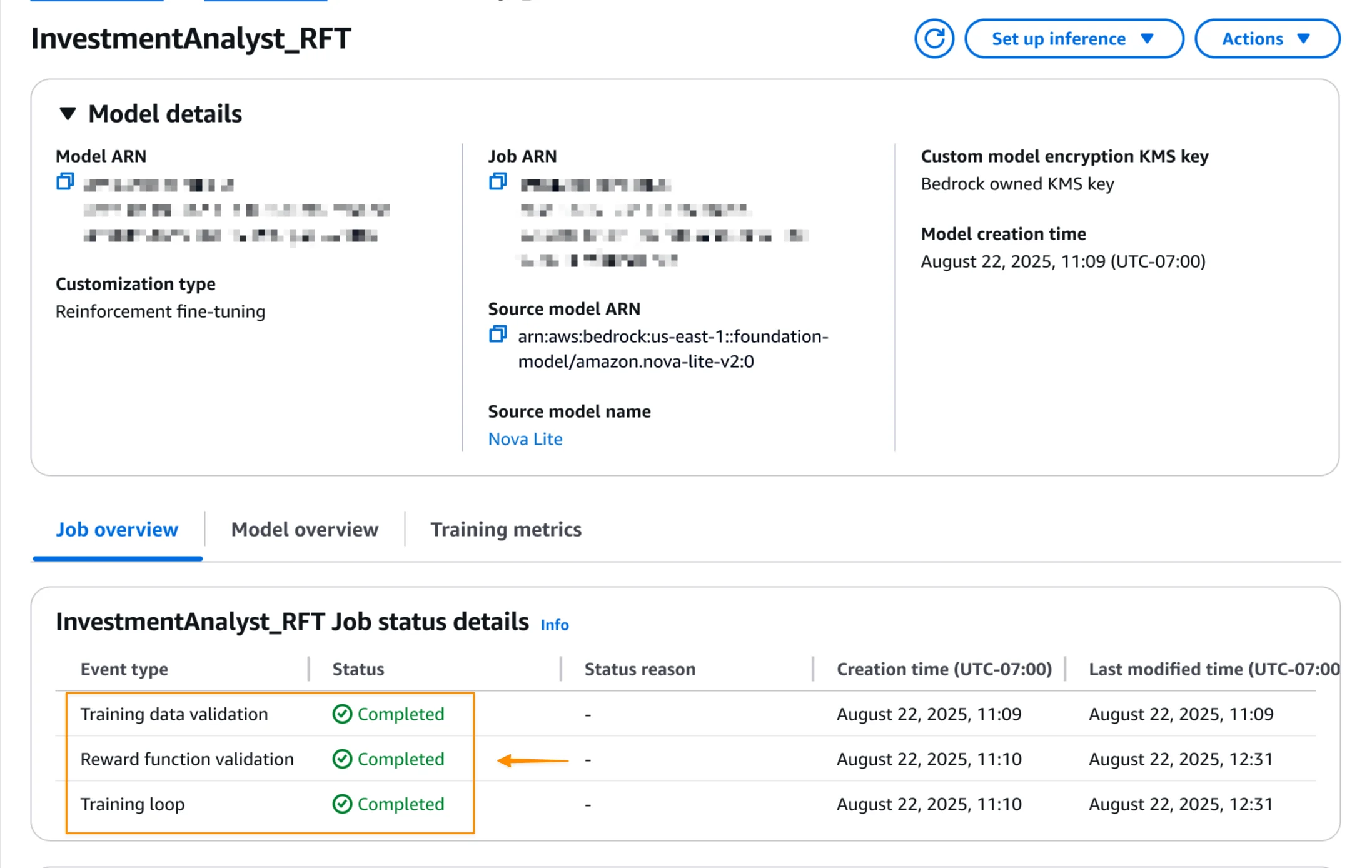 When the reinforcement fine-tuning job is completed, I can see the final job status on the Model details page.