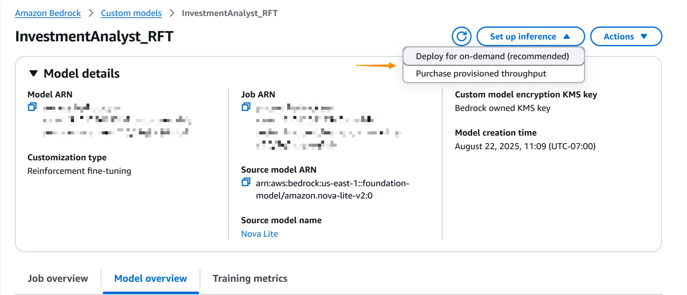 Once the job is completed, I can deploy the model with a single click. I select Set up inference, then choose Deploy for on-demand.