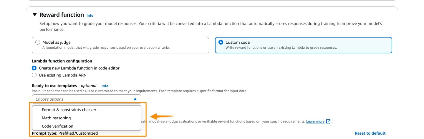 Here, I select Custom code, and I create a new Lambda function or use an existing one as a reward function. I can start with one of the provided templates and customize it for my specific needs.