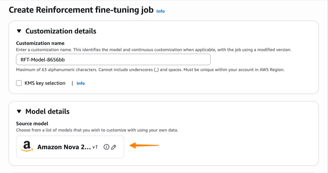 I start by entering the name of this customization job and then select my base model. At launch, reinforcement fine-tuning supports Amazon Nova 2 Lite, with support for additional models coming soon.